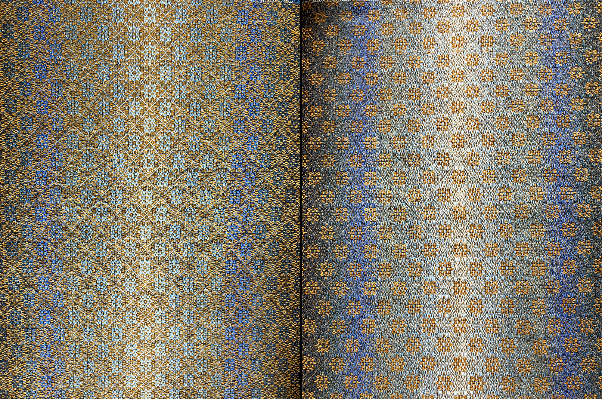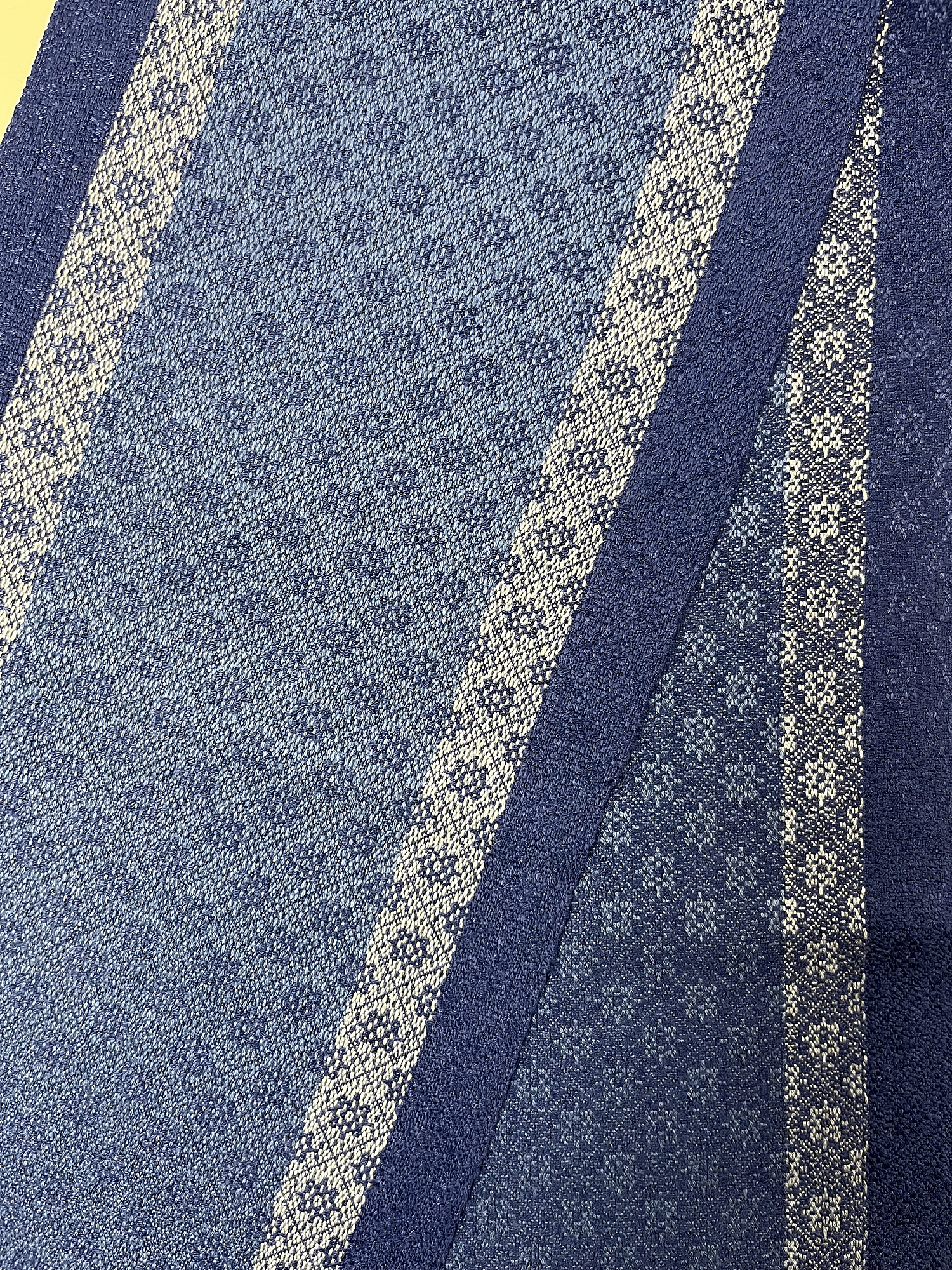I wanted to try the draft before our class, so I used some Bambu 12 yarn in three colors of blue that I got from Suzanne Cali’s stash and wove two scarves in remembrance of her. I sett it at 36 epi and that worked well to keep the motifs square.
